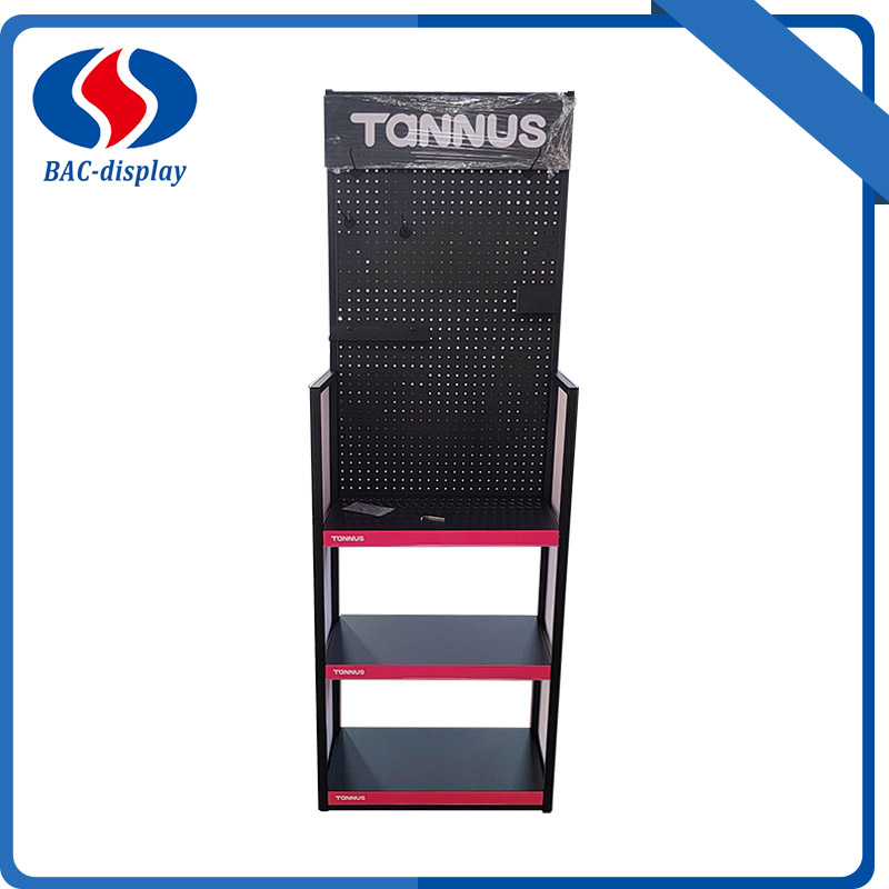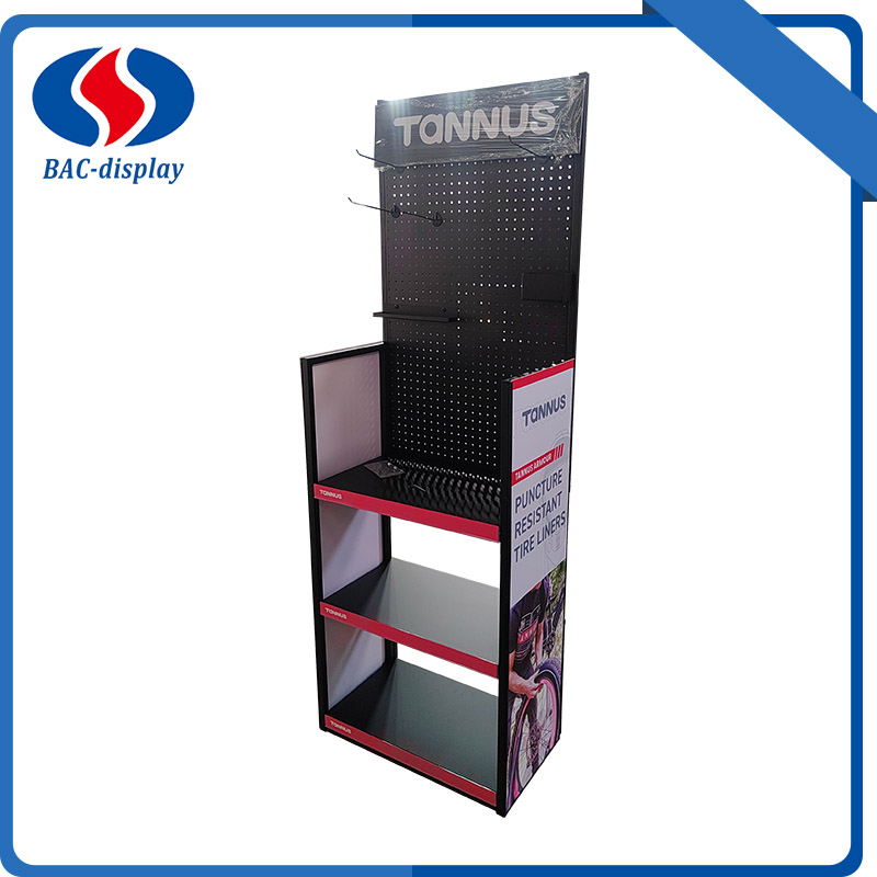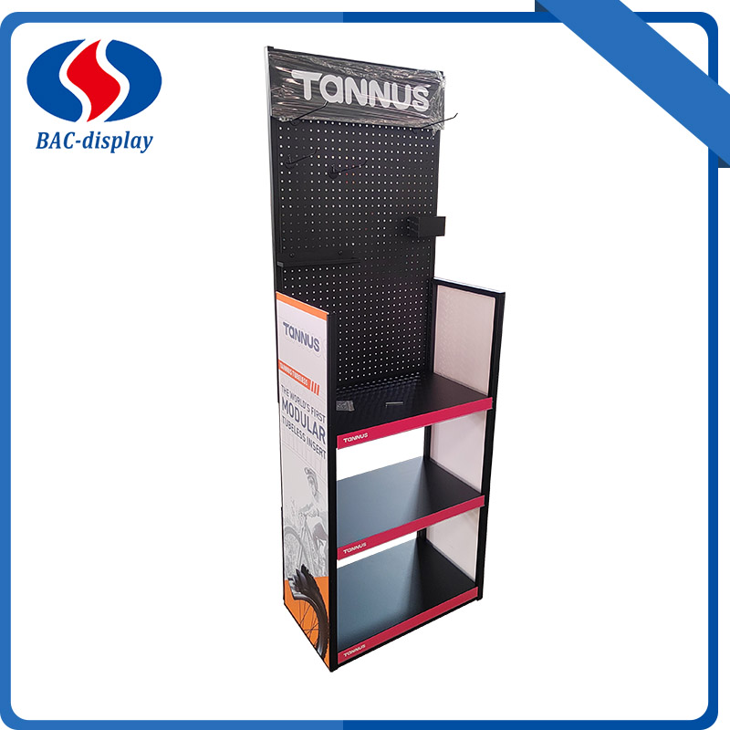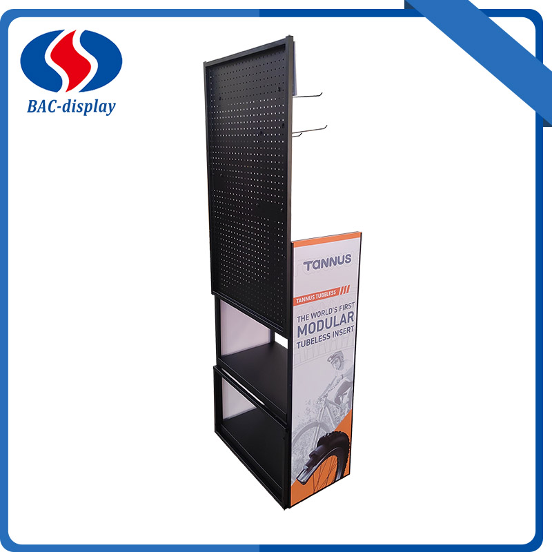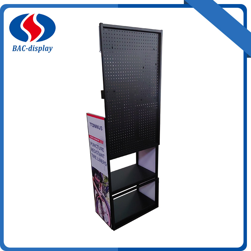 Ten ekspozytor podłogowy z akcesoriami do rowerów wyścigowych jest używany w sklepach lub supermarkecie. Ten stojak ekspozycyjny ma 3 półki i górną ramę z perforacją do wieszania drobnych rzeczy na akcesoria do rowerów wyścigowych. Duża półka może utrzymać duży ciężar sprzedawanych produktów. Dwie boczne tablice mają bardzo dużo miejsca na grafikę informacyjną o produktach. Tablicę reklamową możesz łatwo wymienić na nową.